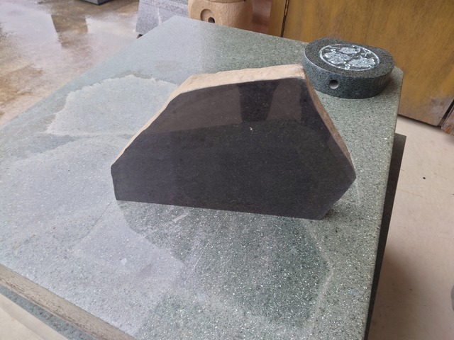 表札① 材質 玄武岩 兵庫県豊岡産 (最後の写真の赤丸①) ・サイズ 横幅340×高さ230×厚み45ミリ ・底面 カット ・裏表 表面、裏面両方 研磨仕上げ ・表面 シマ模様、光沢 良好 文字彫刻費用込み。後ろにボルトを設置して壁に固定するタイプ。石台に置くタイプにも変更できます。ご相談ください。